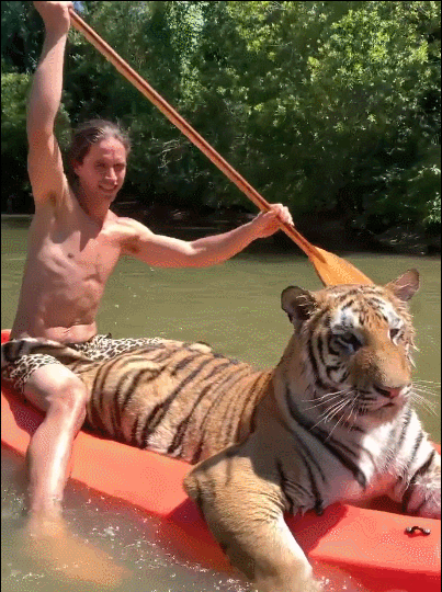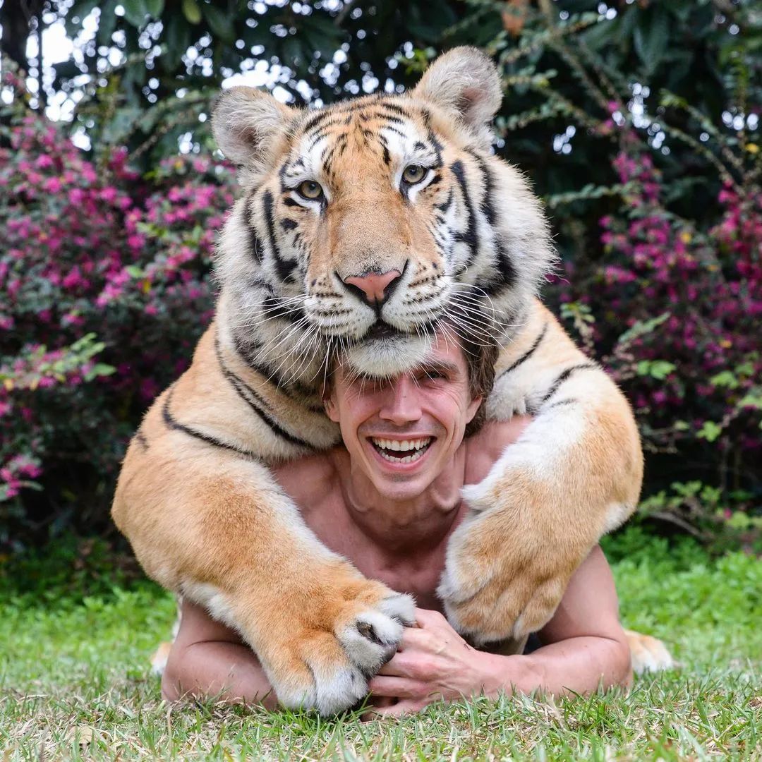 在很多人的认知里,动物管理员一般都是那种拿着棍子或是牵着绳子的样子,但在Kody小哥身上,感受不到一丝“管理员”的感觉。更多的时候他会和老虎一起,