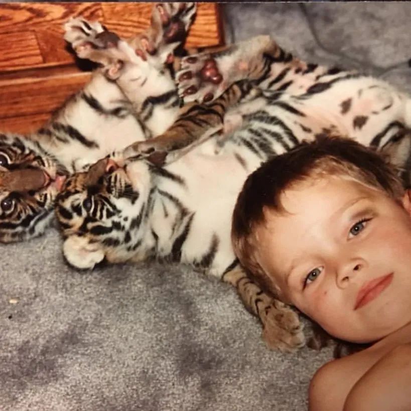 Kody小哥就是在这种环境下出生的,从小他就跟在爸爸身边,一天见到的动物可能比很多小朋友一年里面去动物园看见的动物还要多。别的小朋友和狗狗一起长大,Kody则是和小老虎一起长大,还是同睡一张床的那种:
