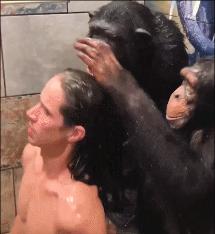 Kody在保护区的日常生活也不外乎吃饭洗澡休闲娱乐,只不过,和他一起进行这些活动的大部分都是动物们。在猩猩的帮助下冲个凉: