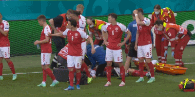 丹麦队在比赛中一直压着芬兰打,创造了多次良机。第42分钟丹麦核心埃里克森在无对抗情况下,突然在前场倒地不起,躺在地上的国米中场眼神发直,球员们赶紧呼唤队医。丹麦队医进场后,在检查了埃里克森的情况后,立即给他做起了心肺复苏!