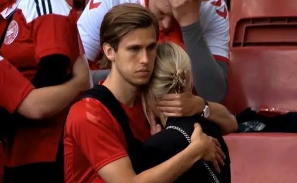 现场的丹麦球迷第10分钟,埃里克森的家人出现在现场,舒梅切尔和克亚尔前往安慰;