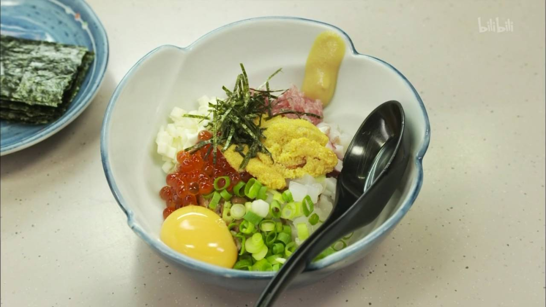 主要食材有纳豆、蛋黄、金枪鱼的鱼里脊、白肉鱼、章鱼、海胆、三文鱼籽、葱、芥末、海苔、酱油等,把所有的食材放在一起然后加入酱油搅拌,做成饭团吃掉。