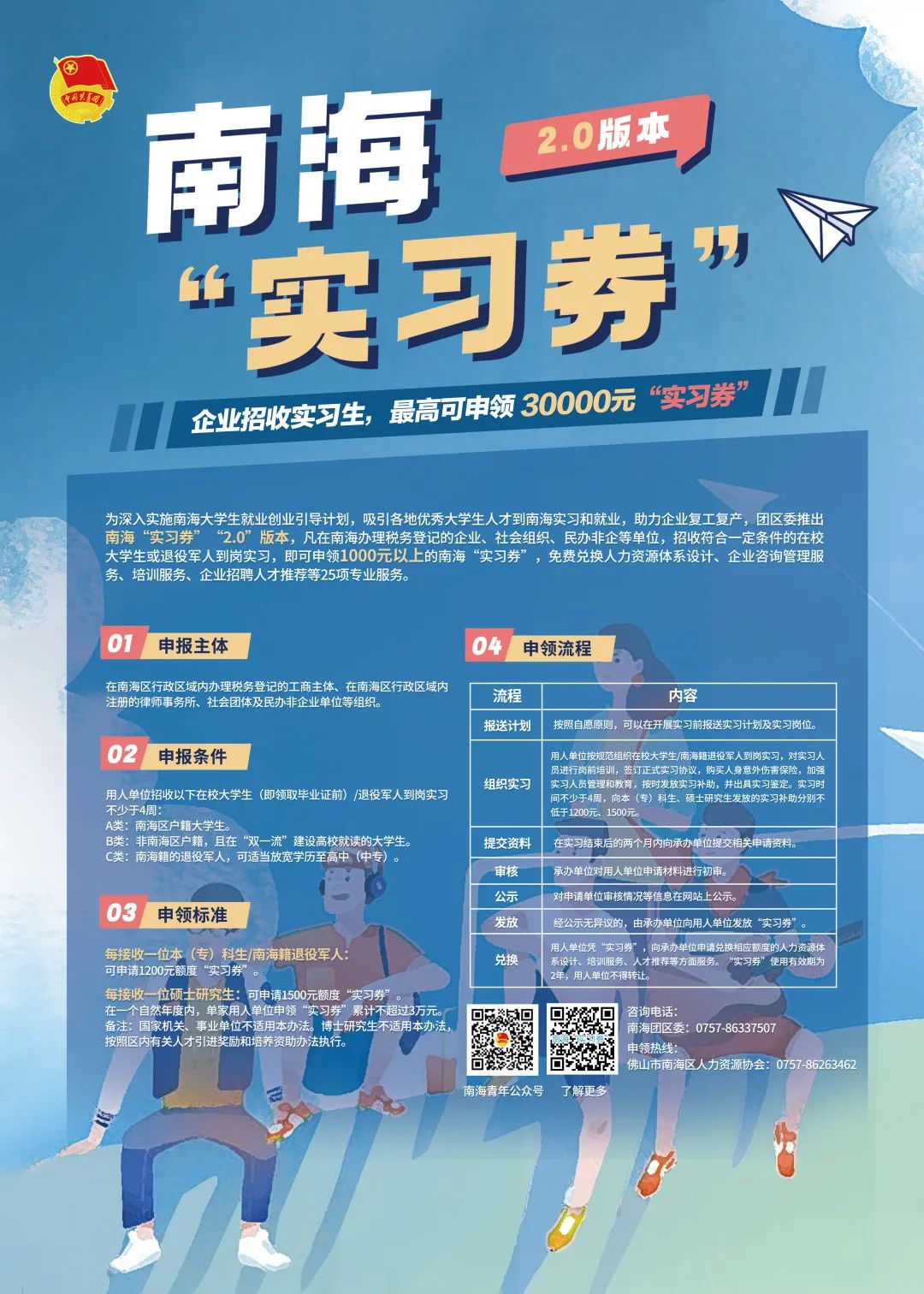 暑期将至,南海区不少用人单位,都计划面向大学生开设实习岗位!南海企业招收实习生,最高可申领30000元“实习券”!同时还有超多就业、创业福利,各位企业主、大学生要收藏!
