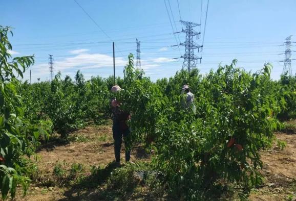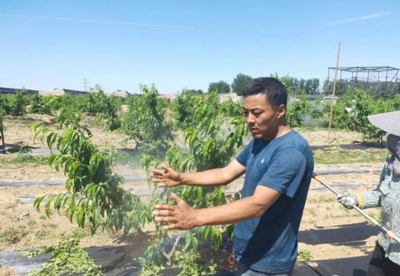一天100块钱,就在家门口上班,不累。在燕郊镇小石各庄铭石源千亩黄桃产业基地,正在给果树打药的村民利大姐说。