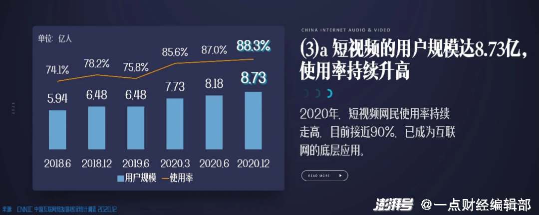 2020年末,短视频用户规模已经达到8.73亿,较2018年6月的5.94亿增长了近47%,使用率持续升高接近90%。