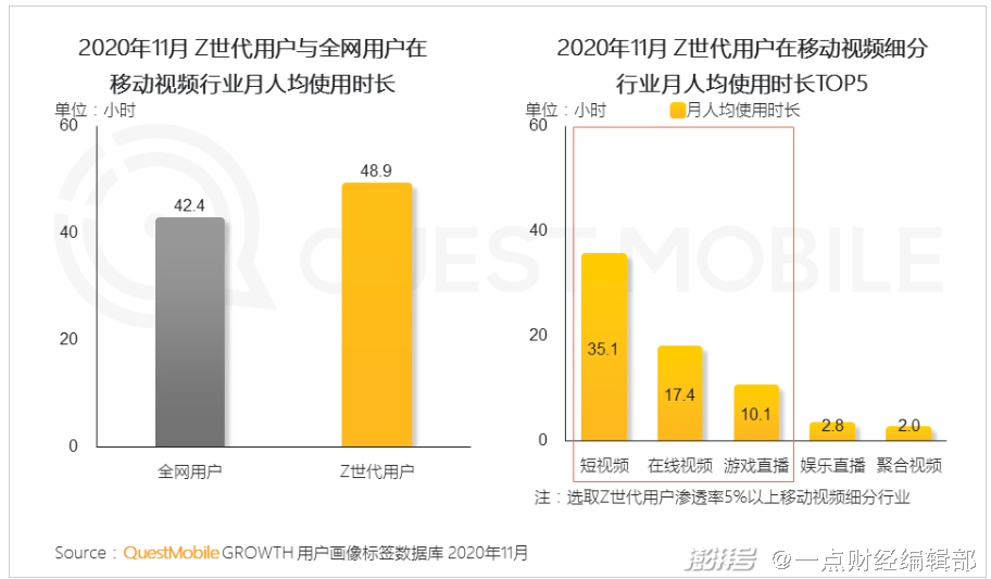 Z世代作为数字化原住民,是互联网行为习惯变迁最敏感、最典型的一代人,而他们也正在从长视频向中短视频倾斜。Quest Mobile《2020 “Z世代”洞察报告》显示,Z世代用户短视频月均使用时长达35.1小时,远超在线视频的17.4小时。