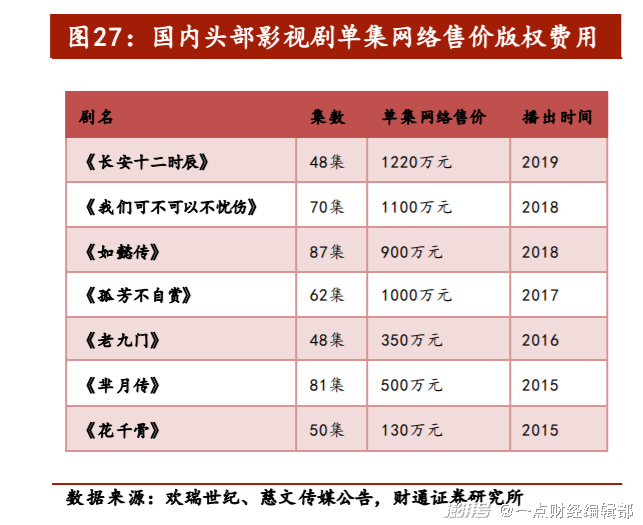 根据财通证券对 2019年热门剧集的价格信息统计,一些热门电视剧的单集网络版权售价已在1000万左右,而这一价格在2015年仅为150万。内容版权价格天花板被越拉越高。