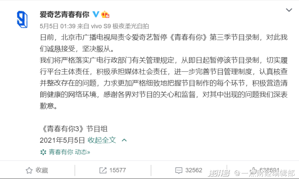 事件发酵后,人民日报、新华社、央视网等多家官媒下场批判,也致使“爱奇艺青春有你”暂停录制。未来长视频平台自制选秀节目的压力只会更大,广告收入必会受到负面影响。