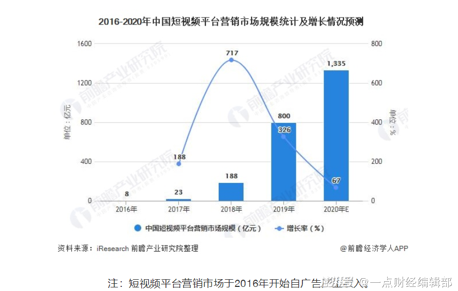 根据前瞻研究院对2021年中国短视频营销行业市场现状及发展前景分析,中国短视频平台投放广告产生的收入由2016年的8亿元增加至2019年的800亿元,年均复合增长率为364%。