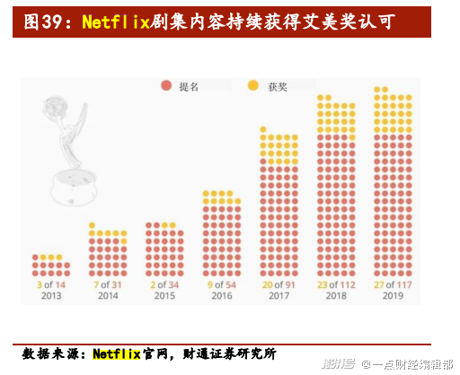 内容上,Netflix优质内容生产水平稳定,电影、剧集内容持续获得奥斯卡、艾美奖的认可。2020年第92届奥斯卡,Netflix凭借《爱尔兰人》《婚姻故事》《教宗的承继》等影片获得了24项提名,成为奥斯卡史上首次超越传统好莱坞电影公司而领跑的新兴公司;2020年艾美奖提名出炉,Netflix以160个提名打破史上单个电视网单届获艾美提名数纪录,反超HBO。