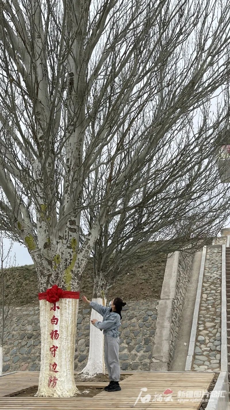 游客在小白杨树下近距离观察。石榴云/新疆日报记者 杨舒涵 摄一棵小树苗激励戍边人