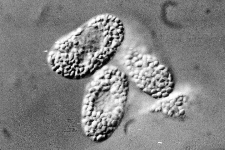 人体的免疫细胞有巨噬细胞、树突细胞、淋巴细胞等等,鲎只有一种免疫细胞,叫作阿米巴样细胞。这种细胞内部有很多小颗粒,显微镜下看起来有点像芝麻饼,只不过那些芝麻粒不是在面上,而是包裹在肚子里。如果这种阿米巴样细胞发现身边有细菌,就开始施展它们的绝技:变形。