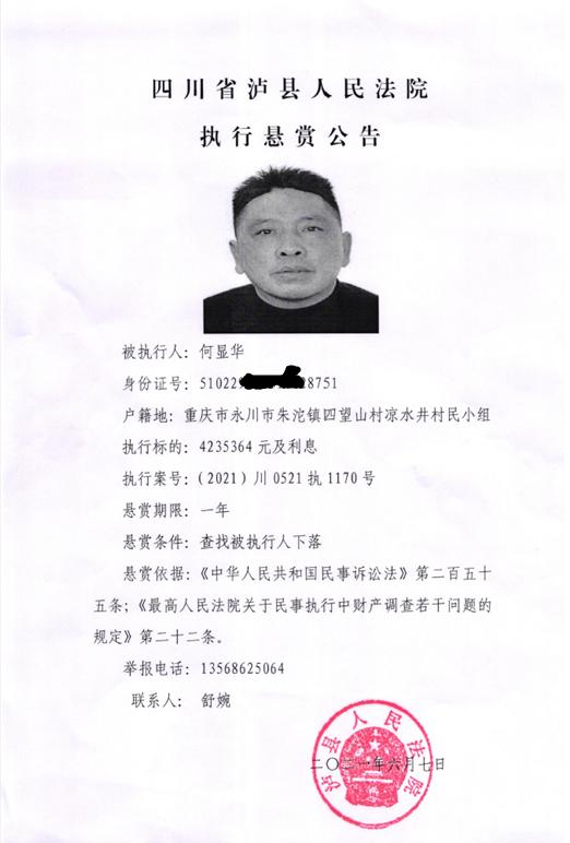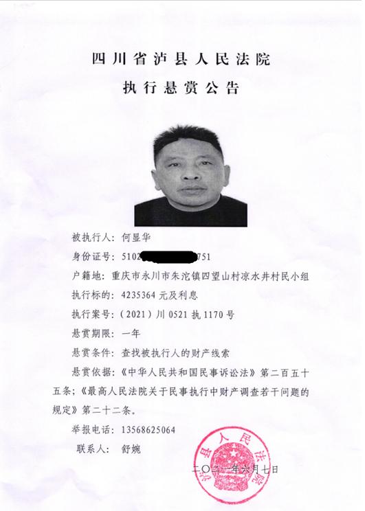 悬赏条件:凡提供被执行人准确位置信息,协助法院找到被执行人的,悬赏金额2万元。或是向本院提供有效线索(不含法院已经掌握的线索),查找到被执行人何显华财产的,悬赏金额3万元,最终获得的悬赏金数额按照财产处置变现到位案款与被执行人应履行案款比例计算。