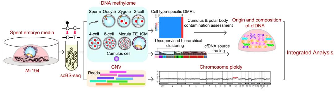 2021年6月15日,北京大学生物医学前沿创新中心汤富酬/文路团队与北京大学第三医院乔杰/黄锦团队合作在The Journal of Clinical Investigation杂志发表题为DNA methylome reveals cellular origin of cell-free DNA in spent medium of human preimplantation embryos的研究论文。该研究对194例体外培养胚胎的培养液(spent embryo culture media,SECM)进行微量DNA甲基化组测序(Post–bisulfite adaptor tagging–based single-cell whole-genome DNA methylation sequencing, scBS-seq),通过和此前该团队合作发表的植入前胚胎的单细胞DNA甲基化组图谱进行系统比较分析,鉴定了培养液中游离DNA(cell free DNA,cfDNA)的准确细胞来源,并在此基础上精准定量了培养液中的来自颗粒细胞的母源DNA污染,进而实现了系统的整合分析(图1)。