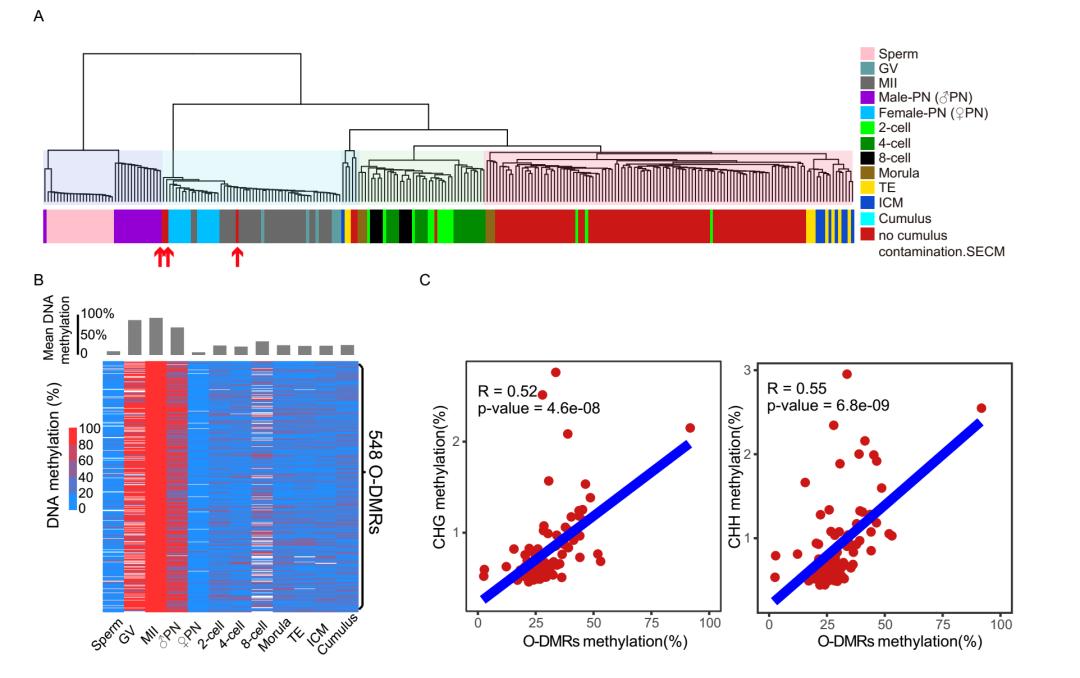 为了进一步量化SECM中污染的极体细胞游离DNA的比例,研究鉴定了548个卵/极体细胞特异高甲基化的差异甲基化区域(O-DMRs),这些区域在卵细胞和雌原核中高度甲基化,而在植入前胚胎细胞以及颗粒细胞中低甲基化(图 3B)。据文献报道,非CpG的甲基化水平在卵母细胞中显著高于其他植入前阶段的胚胎细胞。在无颗粒细胞污染的SECM中,CHG和CHH(非CpG)的甲基化水平与O-DMRs甲基化水平呈正相关,表明SECM中有时存在极体细胞污染(图 3C)。