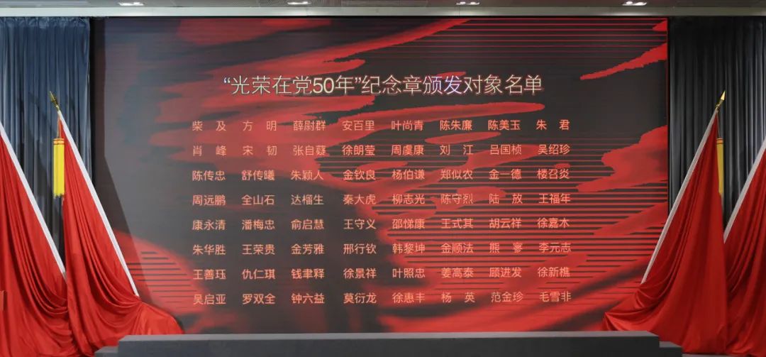 党委副书记孙旭东宣读“光荣在党50年”纪念章颁发对象名单随后,在场老党员及其家属一一上台,金一斌向其颁授“光荣在党50年”纪念章。