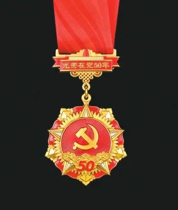 “光荣在党50年”纪念章通径为50毫米,材质为铜和锌合金,主色调为红色和金色。主章由党徽、五角星、旗帜、丰碑、向日葵、光荣花、光芒等元素构成,其中党徽象征党的领导核心地位和党员信念坚定、对党忠诚;丰碑寓意党的光辉历程和丰功伟绩;向日葵寓意全党全国各族人民紧密团结在党中央周围;光芒象征党的光辉照耀;五角星代表薪火相传;光荣花寓意繁荣盛世、国泰民安和褒奖荣耀;旗帜象征共产主义崇高理想与事业永续。副章由山河、中国结和红飘带等元素组成,飘带上雕有“光荣在党50年”字样,寓意党员不忘初心、牢记使命,勇攀高峰、永葆青春。