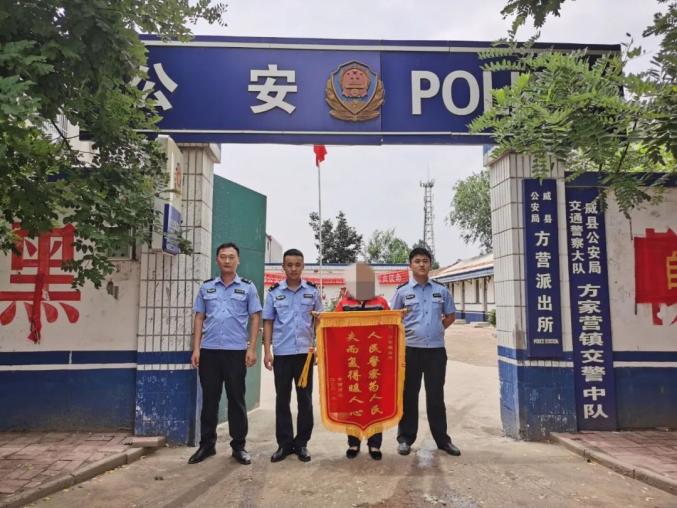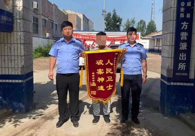 上午10时,方营镇翟家庄村村民李某将一面印有“人民卫士 破案神速”的锦旗送到了方营派出所民警手中,感谢民警为其追回了被盗钱财。