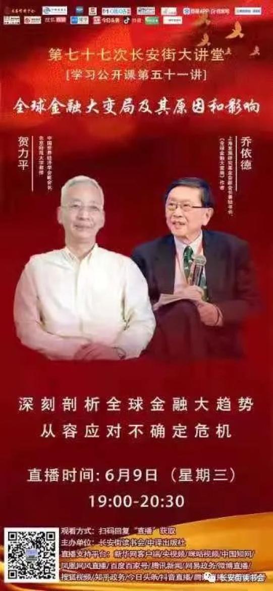 6月9日晚19:00,长安街读书会联合中译出版社主办的“全球金融大变局及其原因与影响”之学习公开课第五十一讲,在长安街读书会及其党建、中直、京直、干教、政法、企干、援疆、健康、地方、媒体、出版、博士团、英才中心等分会微信群,并在央视频、咪咕视频、中国知网、凤凰网风直播、百度百家号、腾讯新闻、网易政务、微博直播、搜狐视频、知乎政务、今日头条、抖音直播、西瓜视频、腾讯直播、微信视频号等平台同时进行。活动邀请了中国世界经济学会副会长、北京师范大学教授贺力平,上海发展研究基金会副会长兼秘书长、《全球金融大变局》作者乔依德,在线对谈解读“全球金融大变局及其原因和影响”这一话题。