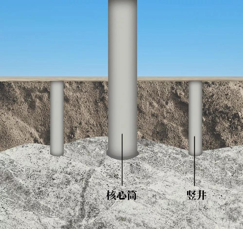 其次,为外部的立柱打下基础。工人们在核心筒周围挖了一圈竖井,每根竖井有20米至40米深,4米至5米粗。挖井的过程中,用环形混凝土梁固定,以防止潮湿的土壤进入竖井。挖至基岩之后,再用混凝土浇筑竖井。