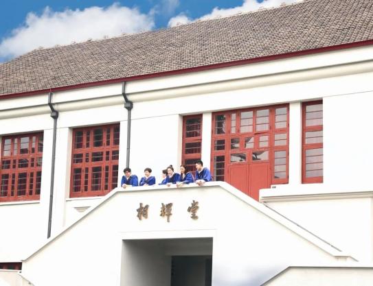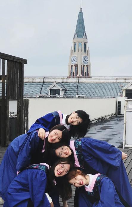 明法楼天台在伸手就能碰到天空的地方,将华政的芳草地、红砖墙尽收眼底,将大学四年的时光唱成歌,惟愿红墙不老,芳草长春。