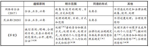 表1 网络安全法、民法典与《草案》之知情同意原则的对比从上表中,我们可以发现从网络安全法到民法典,在到《草案》,有关知情同意原则的规定不断细化和具体。在遵循的原则上,《草案》使用了若干个条文进行了规定,至少还新增了诚信原则。在描述信息收集和利用者的行为上,网络安全法并没有采用“处理”之表述,但民法典和《草案》均采用了“处理”之表述,且二者的含义一致。在明示的范围上,从网络安全法到《草案》也呈现出扩张的趋势,处理者的身份、联系方式以及被收集者的行权方式和程序都纳入明示范围。于是,从内容上看,隐私政策条款也将呈扩张之势,条款的日益冗长似不可避免。另外,民法典和《草案》均规定了对个人信息的合理使用情形,此时为豁免适用告知同意原则的情形,且豁免情形呈现出扩大趋势。