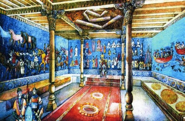 撒马尔罕宫殿的使者厅壁画也体现了当时流行的世界四大君主的概念,当时反应的四大王还是突厥可汗,唐朝天子,罗马皇帝和波斯国王在行政上,苏莱曼记载中国有200多城市,这个可能是虚数;每个地区的行政中心是府,府周围有附属的小城镇;按照唐制,每个府都有四个鼓楼,每个鼓楼配有5个号筒,10个大鼓,每天白天和夜里,鼓号象征著开市和闭市,也是白天和黑夜的界限标志。这是对当时城市管理制度的真实记载,按照唐制,当时的长安城就是“五更三筹,顺天门击鼓,听人行。昼漏禁,顺天门击鼓四百槌讫,闭门。后更击六百槌,坊门皆闭,禁人行;闭门鼓后,开门鼓前,有行者,皆为犯夜。”