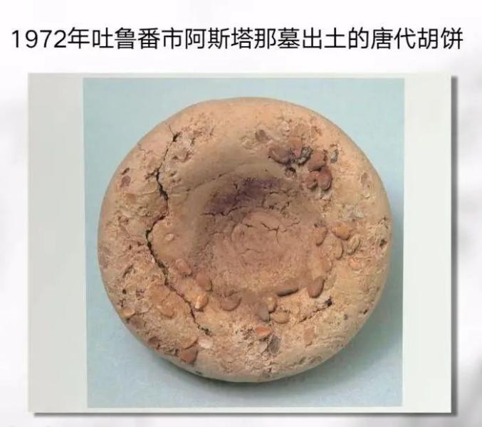 唐代胡饼化石,类似于现代的小馕,用小麦面制成,表面粘着的果仁粒粒饱满清晰在饮食上,唐人的主食是大米和麦,南方多吃米,北方多吃麦,有时,也把菜肴放入米饭再吃。王公们则吃精致面食及各种动物的肉,甚至猪肉和其他肉类。水果有苹果、桃子、石榴,榅桲、香梨、香蕉、甘蔗、西瓜、无花果、葡萄、黄瓜、睡莲、核桃仁、扁桃、榛子、黄连木、李子、黄杏,还有椰子果。中国没有多少枣椰树。他们喝自己用发酵稻米制成的饮料,但苏莱曼却错误记载了中国没有土产葡萄酒这一点,事实上受惠于南北朝时代粟特人引进的葡萄种植技术,唐代时山西河东的干和葡萄酒非常有名,苏莱曼可能是没有去过北方,只见过米酒,所以才在南中国的环境中做出了这样的判断。当然,在叛乱诸侯或者边疆外族被击败之后,唐人还会分吃战败者的肉,这在中国人的观念里并不罪恶。