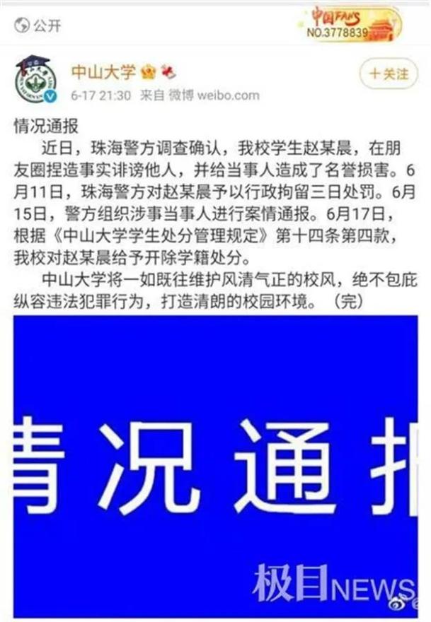 当晚,中山大学官方微博发布情况通报,称近日珠海警方调查确认,该校学生赵某晨,在朋友圈捏造事实诽谤他人,并给当事人造成了名誉损害。6月11日,珠海警方对赵某晨予以行政拘留三日处罚。6月15日,警方组织涉事当事人进行案情通报。6月17日,根据《中山大学学生处分管理规定》第十四条第四款,该校对赵某晨给予开除学籍处分。