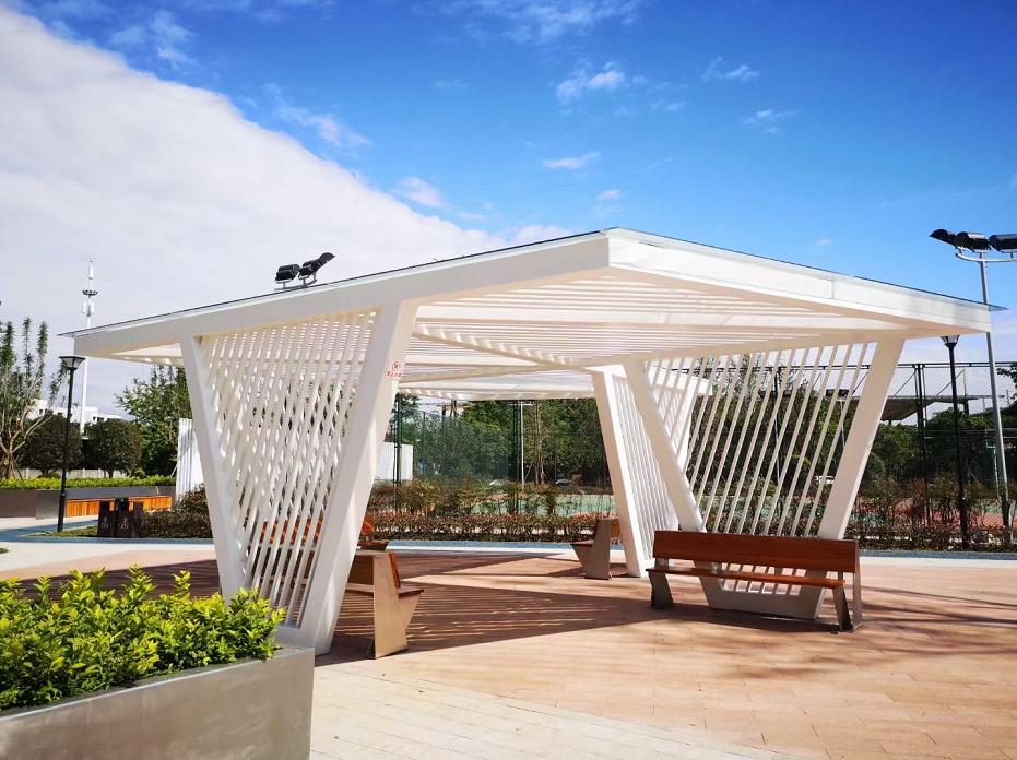 上新的游园力求为居民提供“四感”体验,即自然与科技相融合的和谐感、网球竞技挥洒出流畅的运动感、现代与后现代整体风格的时尚感、芳草满园花满目的植物多样性和悠闲舒适感。“