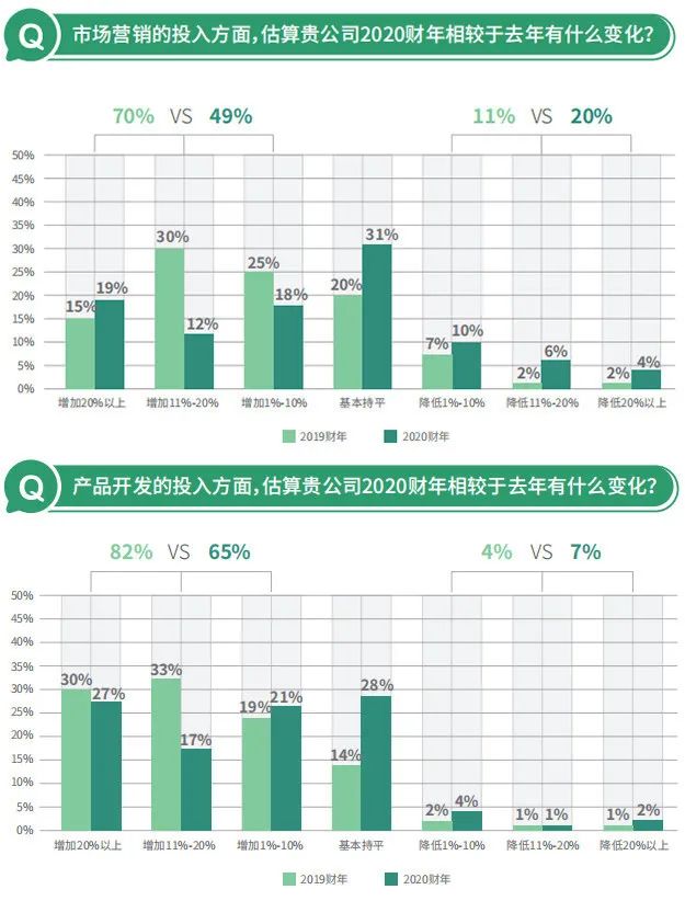 增加这两项投入的企业比重相较于2019财年的调查结果有所减少。相比于增加市场营销投入以取得更好的业绩,更多的企业倾向于在产品开发方面增加投入。