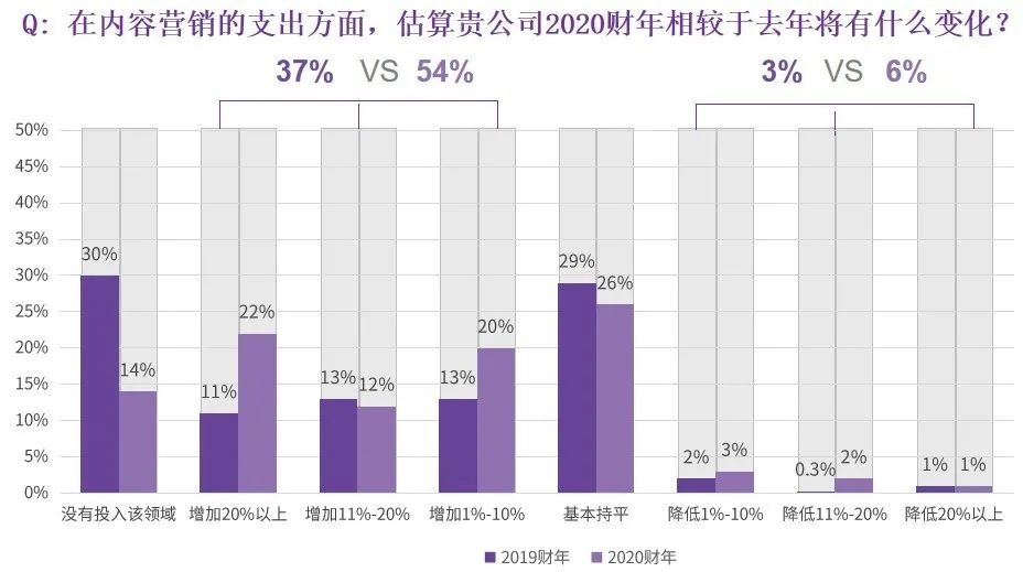 54%的受访企业于2020财年增加了内容营销方面的支出,2019财年这个数字为37%;没有开展内容营销的企业仅占14%,而2019财年该数字为30%。总体而言,企业对内容营销的投入有上升的趋势。