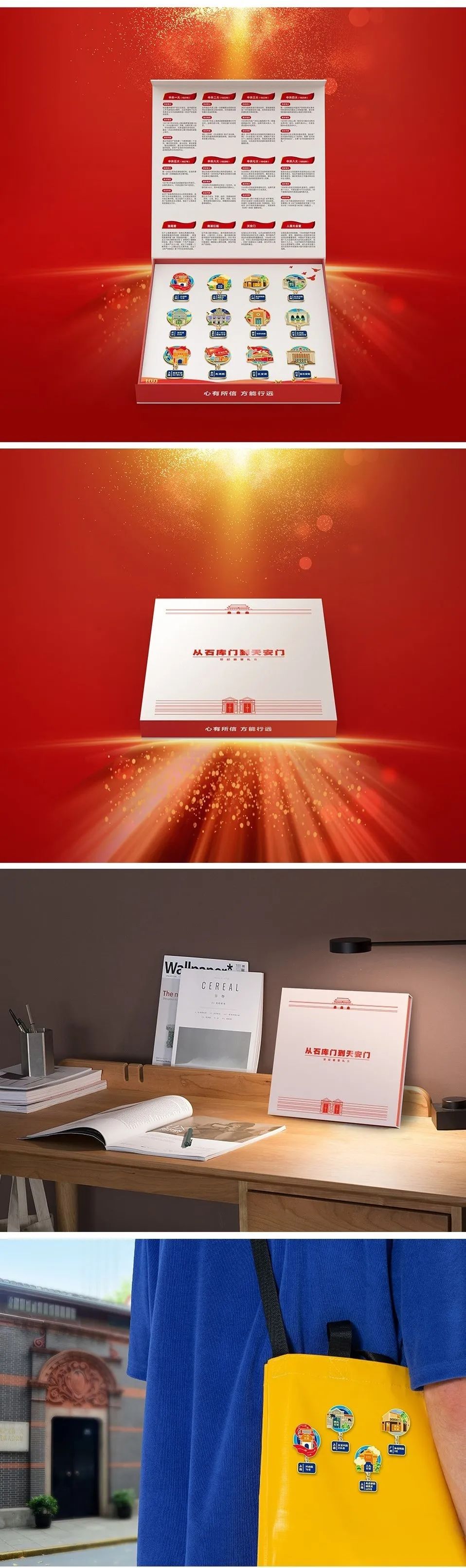 以党的诞生地建筑石库门和开国大典举办地天安门为主题,以党的历次全国代表大会会址为主线,并加入点燃共产主义火种的渔阳里以及象征中国革命源头的南湖红船……除了这枚“一大”会址徽章,满满一盒 “从石库门到天安门”世纪徽章套装,为你诉说难忘的红色故事。