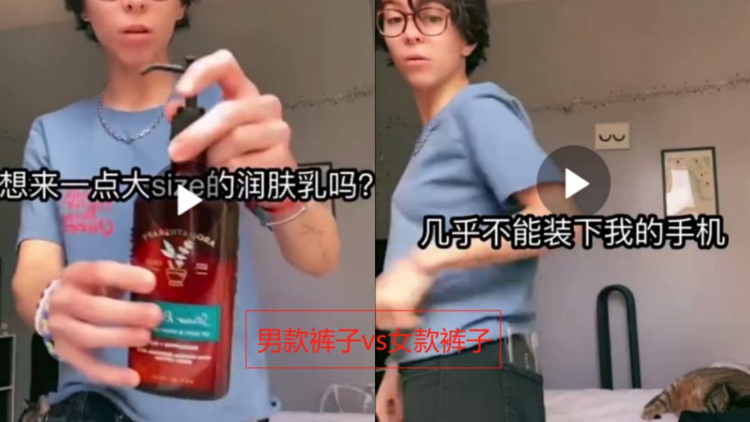 通过对比男女款长裤的裤兜,博主发现女装的裤兜连手机都放不下,轻轻松松就可以被拿走,甚至有的裤兜只是装饰。但是男款的长裤裤兜可以同时放下大号的润肤乳、充电宝、大盒糖果、手机等,大到可以放下“一整个浩瀚而未知的宇宙”。