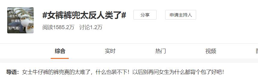 微博网友@活体复读机分享男女装裤兜的差别许多女性出门时会备上口红、纸巾、耳机这些小东西,如果裤兜又塞不下这么多小物件,她们就会选择携带包包出门。