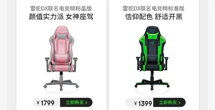 雷蛇DX联名电竞椅信仰配色标准版1399元,颜值实力派女神座驾1799元。