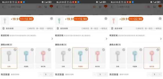 苏宁迷你的小风扇也在颜色上做了价格区分,将更具有女性特色的粉色风扇价格涨到22.9元,其他颜色则为12.9元。