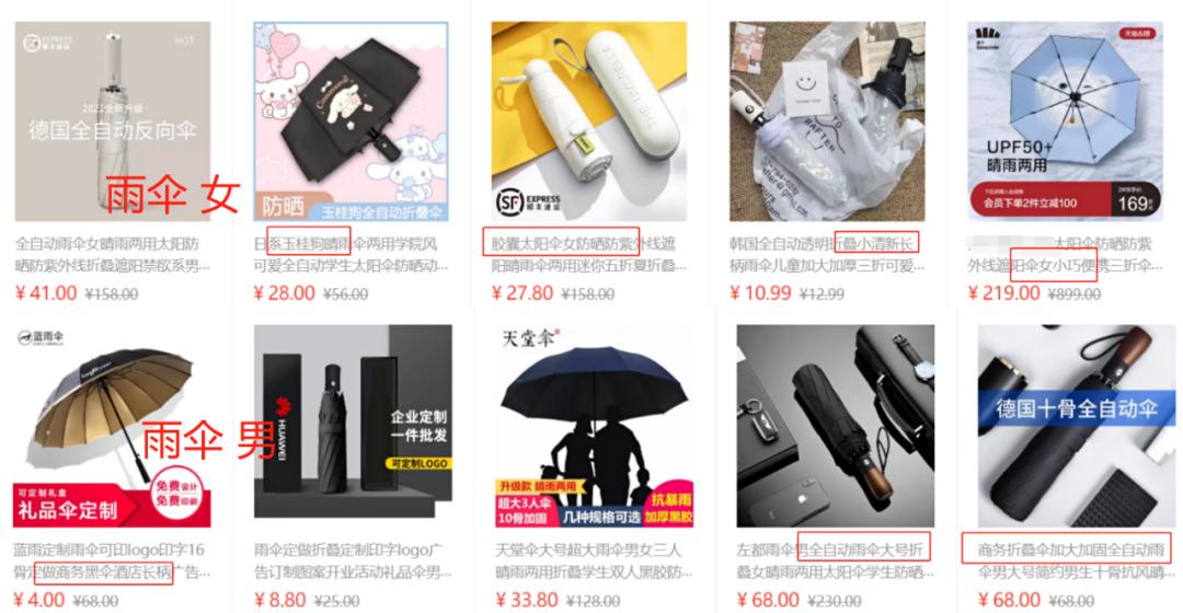 精巧的女款雨伞与结实的男款雨伞。商家抓住了女性更爱“精致”的特点,在外观上大做文章,提高产品的价格。但同样字条性别一换再搜索,却多为“大固厚结实双人耐用”。