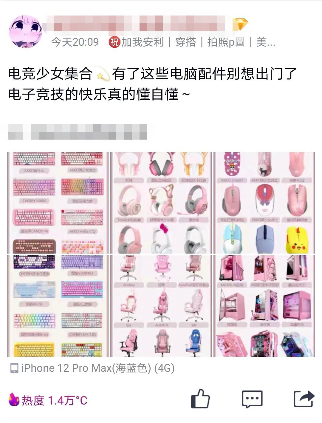 各大平台打着“电竞少女”旗号的电脑配件,将普遍的款式换个包装,基础款耳机换上猫耳。或者是和XXX联名进行安利,被网友总结为粉红税避雷大全。有人评论道: