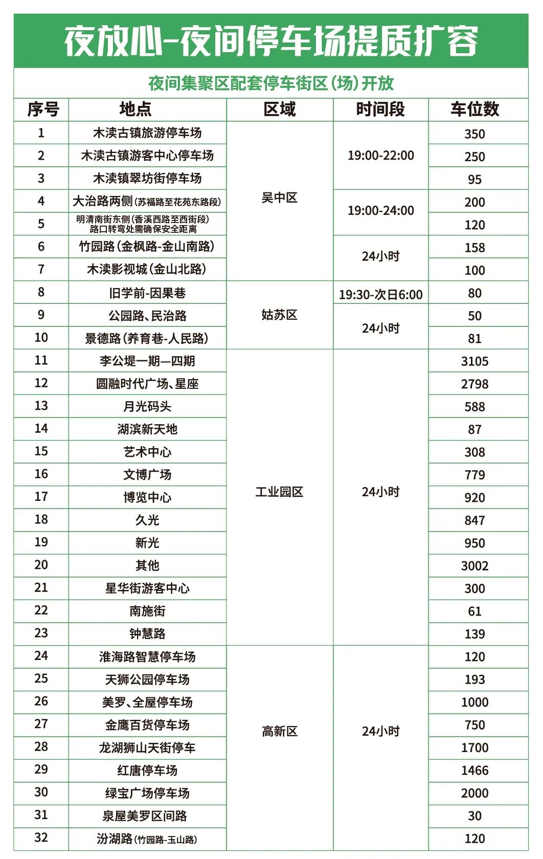 夜间停车场提质扩容四大集聚区新增夜间临时停车点,开放24小时停车位,近23000个停车位保障夜间停车需求。