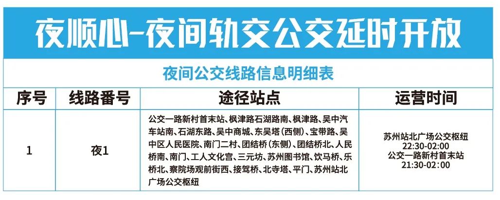 夜间轨交公交延时开放轨交1号线重点车站周五周六末班车时间延长至23点30分,20条夜间公交专线打造夜间公交线网,最长运营至凌晨2点。