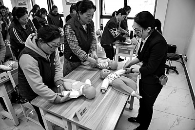 湖南长沙市的职业培训学校老师在育婴员培训班上为学员们讲解抚触婴儿的手法及注意事项。 新华社发