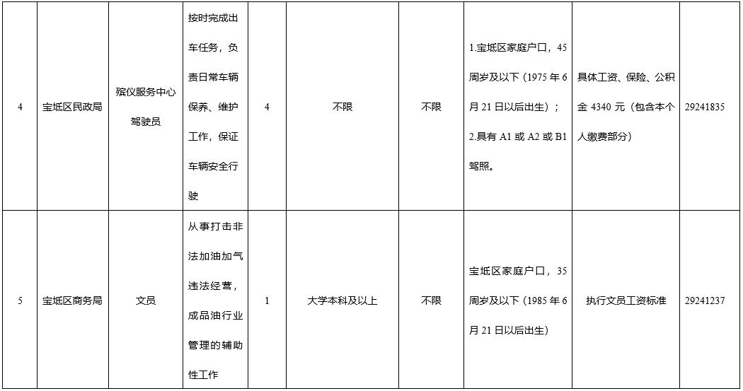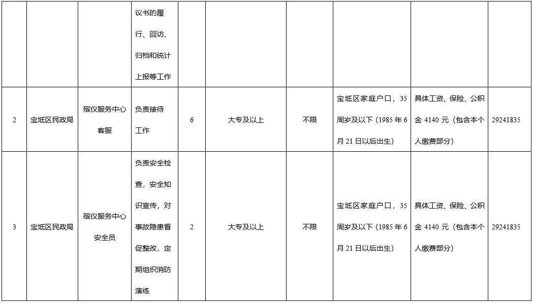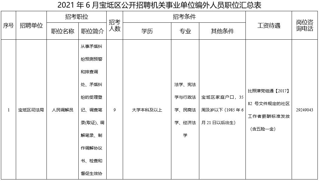 宝坻区司法局专职人民调解员9人,宝坻区民政局殡仪服务中心客服6人、安全员2人、驾驶员4人,宝坻区商务局文员1人。具体要求详见《2021年6月宝坻区公开招聘机关事业单位编外人员职位汇总表》。