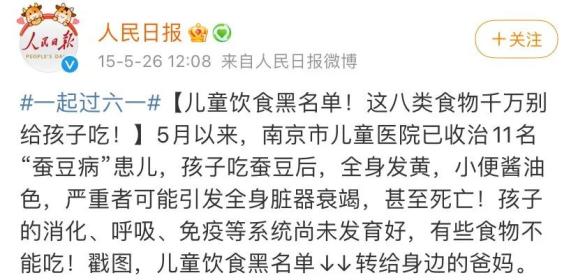 人民日报之前也发过一个“儿童饮食黑名单”,建议不要给 8 岁前的孩子吃蚕豆。