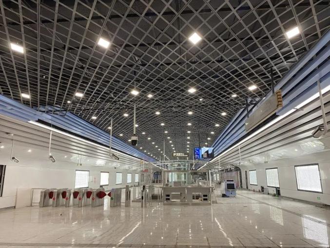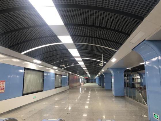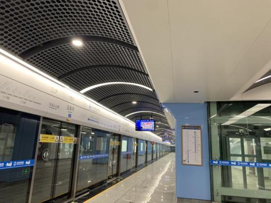拱形吊顶也是玉泉河站的一大特色。优化间隙的LED灯、弧形的吊顶、墙面的“科技蓝”交相辉映,一进入车站仿佛来到了“时空隧道”,引起对于未来的无限畅想。