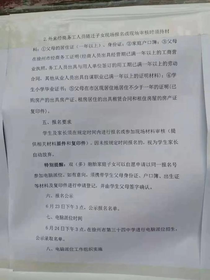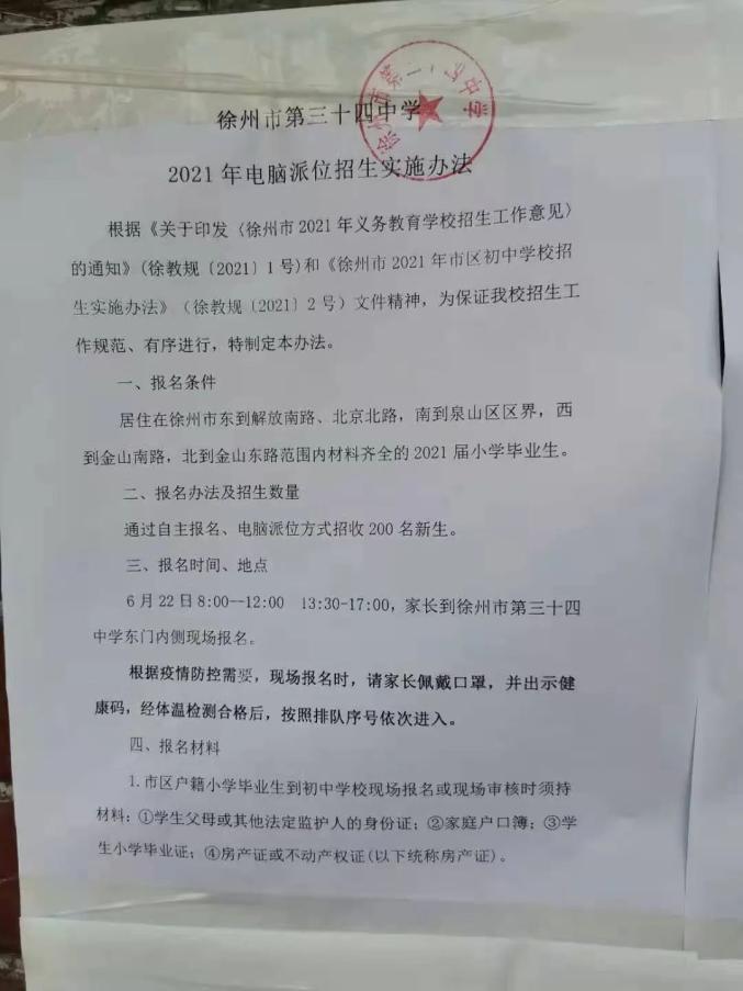 报名参加我校电脑派位的,须是在东到迎宾大道,南到欣欣路,西到北京路,北到三环南路的范围内和居住在铜山新区、持有市区户口且市区无房产,持相关证明材料于2021年6月22日到学校初中部门口排队领取序号,根据序号进行体温检测、登记,分批次进入(注意务必戴口罩,相互之间保持一米间距)。双(多)胞胎家庭子女可以自愿申请以同一报名号参加电脑派位。如有意向,须携带学生父母身份证、户口簿、出生证等材料及复印件进行申请登记,并由学生父母签字确认。