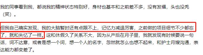 产后夜里有老公起来照顾孩子,产后3个月能睡整觉,身材也恢复得很好,但是重返职场后,发现自己重回职场,大脑跟不上了:记忆力衰退,脑子绕不过来。