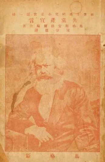 一本发黄的小册子,三十二开、五十六页,竖排。红色的封面上印有马克思半身肖像,一行小字标注“社会主义研究小丛书第一种”,书名为《共党产宣言》。