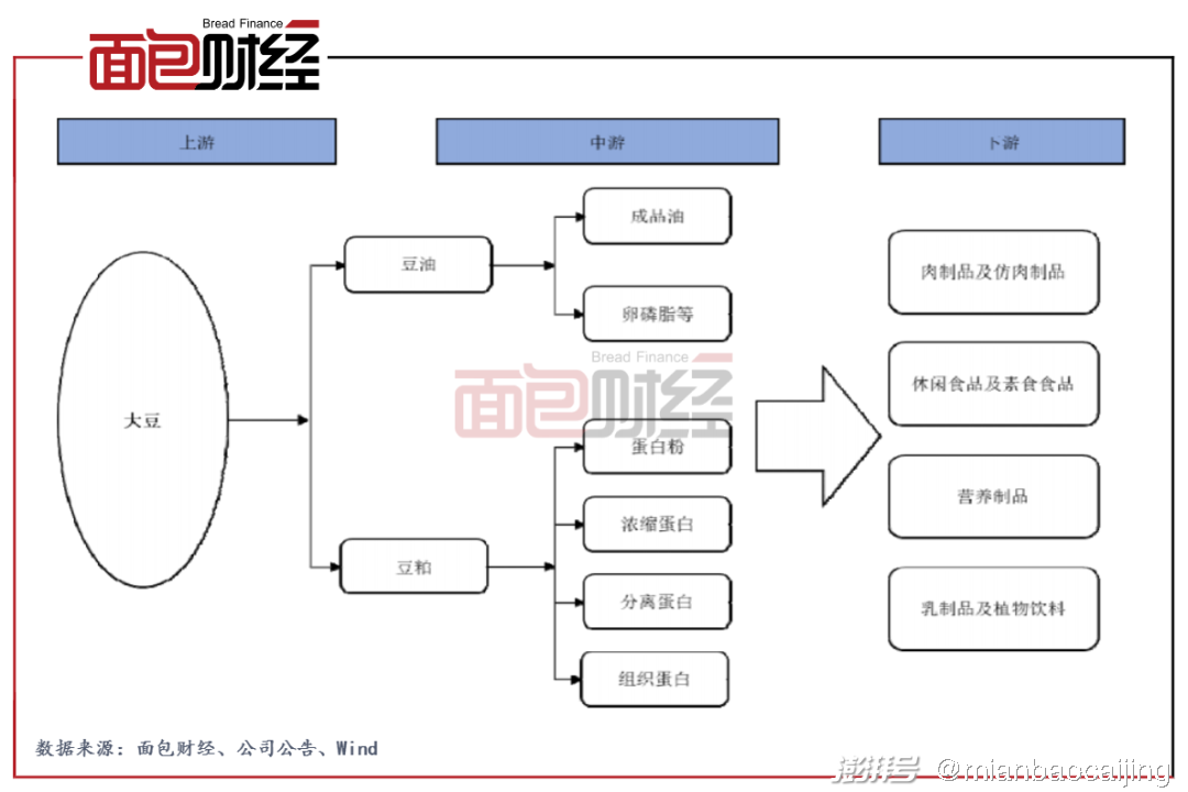 纵观公司所处产业链,上游为大豆种植农户及大豆经销商,下游主要是肉制品加工、仿肉制品、休闲食品、素食食品、营养制品、乳制品及植物蛋白饮料企业。下游行业的发展状况和对大豆蛋白的应用将直接影响到行业发展。