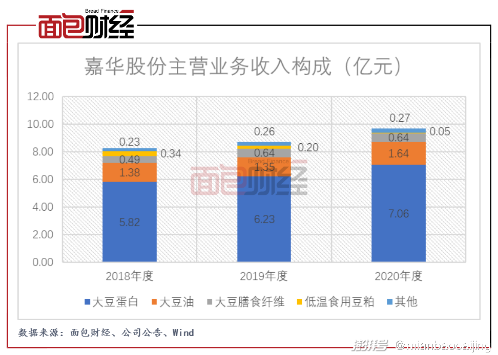图1:嘉华股份主要产品与上下游行业关系图嘉华股份主营产品包括大豆分离蛋白、大豆油、大豆膳食纤维、低温食用豆粕等。其中,大豆蛋白的收入占比逐年上升,2020年实现营收7.06亿元,占主营业务收入的73.11%,是公司的核心产品及主要收入来源。